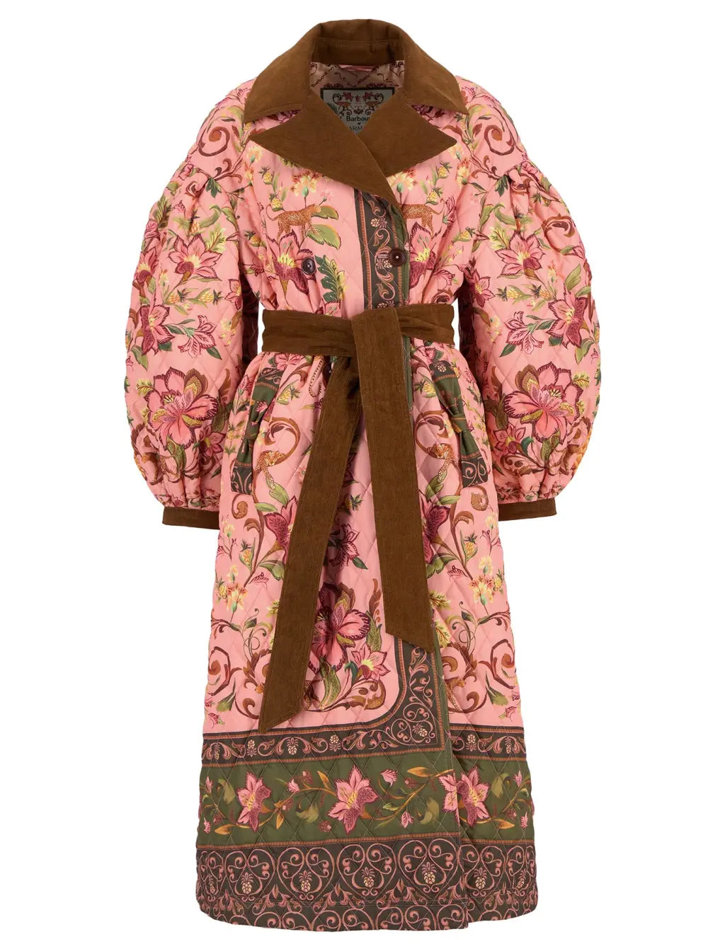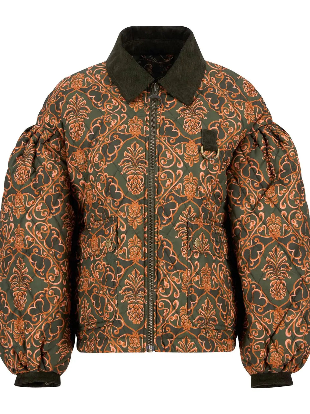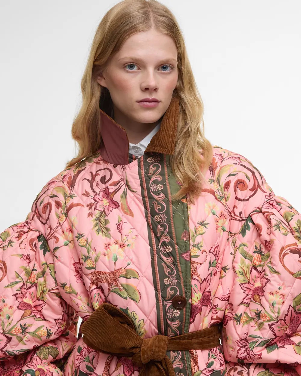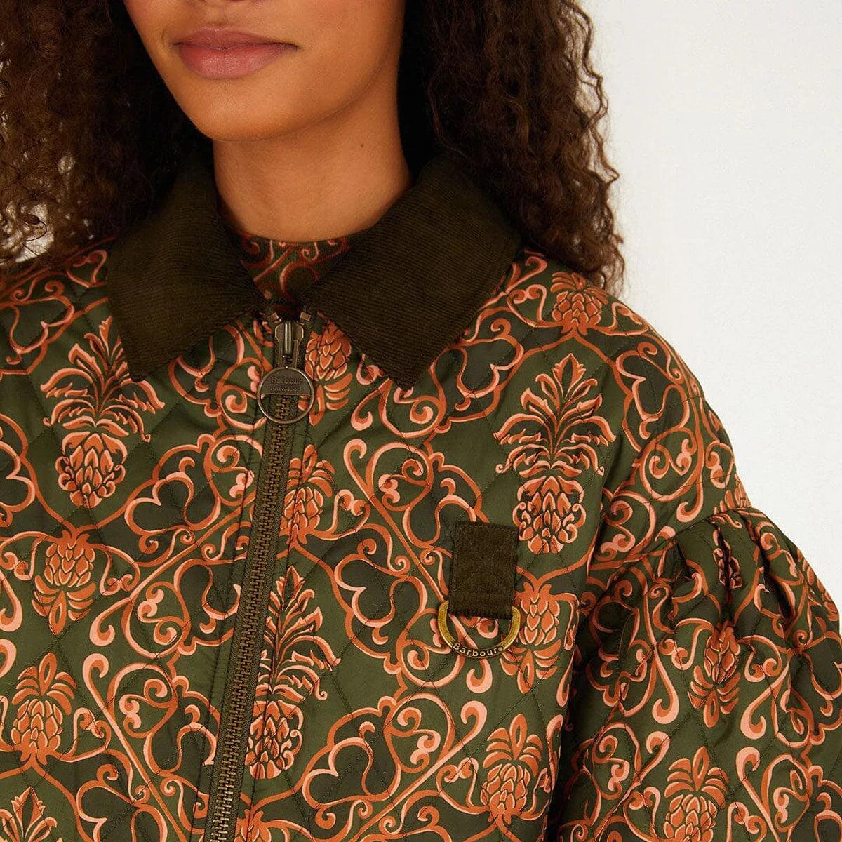 This shorter-length, diamond quilted jacket showcases the exclusive Barbour Farm Rio Pineapple print all over, complemented by exaggerated gathered sleeves for an added feminine touch. Trimmed with Barbour's signature cord collar and trims, patch pockets, D-ring and dual-branded studs, this oversized quilted jacket is perfect for expressing yourself with every wear.