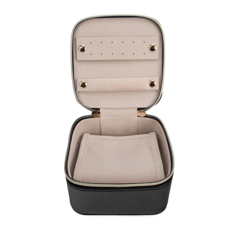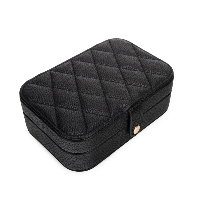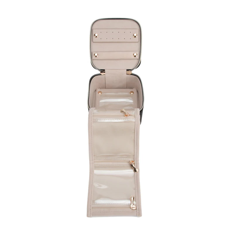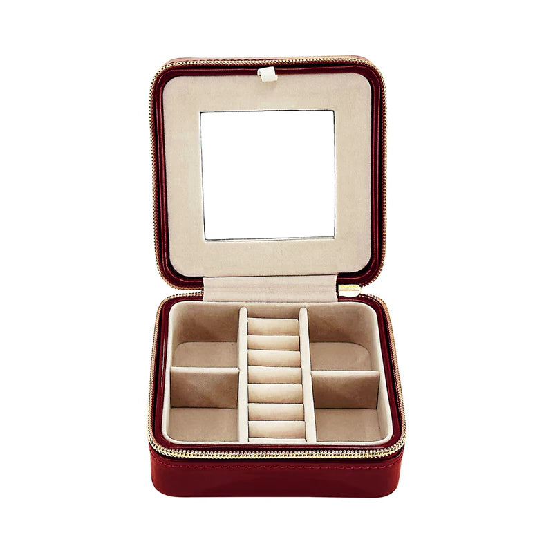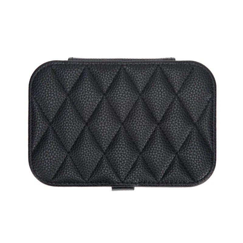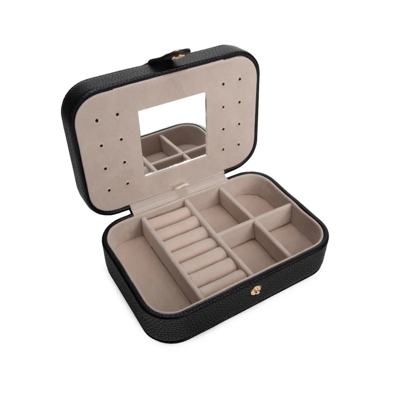 Regular price $30.00Meet the Leah 5 Eyewear & Jewelry Case - your ultimate accessory game-changer! Crafted from luxurious pebbled vegan leather with a soft velour interior, it’s designed to keep your eyewear and jewelry safe and sound. Its sleek snap closure ensures everything stays compact and portable, while the handy hanging loop offers easy access wherever you are. Inside, find a built-in mirror and smart compartments for seamless organization. It fits up to 2 pairs of sunglasses or reading glasses, secures 21 stud earrings with a special earring card, and even has a lift-up feature for your larger earrings. Plus, with 5 loop snaps, your bracelets and necklaces stay free from tangles, and 3 pillow rolls keep your rings snug. Get ready to elevate your accessory storage with style and sophistication!