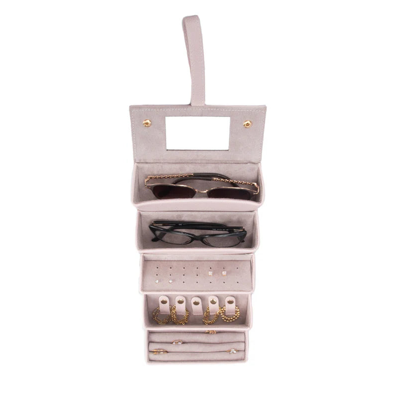 EXCELLENT ORGANIZER: Measuring 6.3" x 5" x 5" (L x W x H), Versatile spaces for sunglasses, jewelry, or watches. Holds 2 pairs of sunglasses or reading glasses, fitting most sizes. Dedicated spot with an earring card for 21 studs and space for larger earrings. Compartment with 5 loops for bracelets or necklaces. Includes 3 rolls for rings or earrings. Built-in mirror for jewelry.