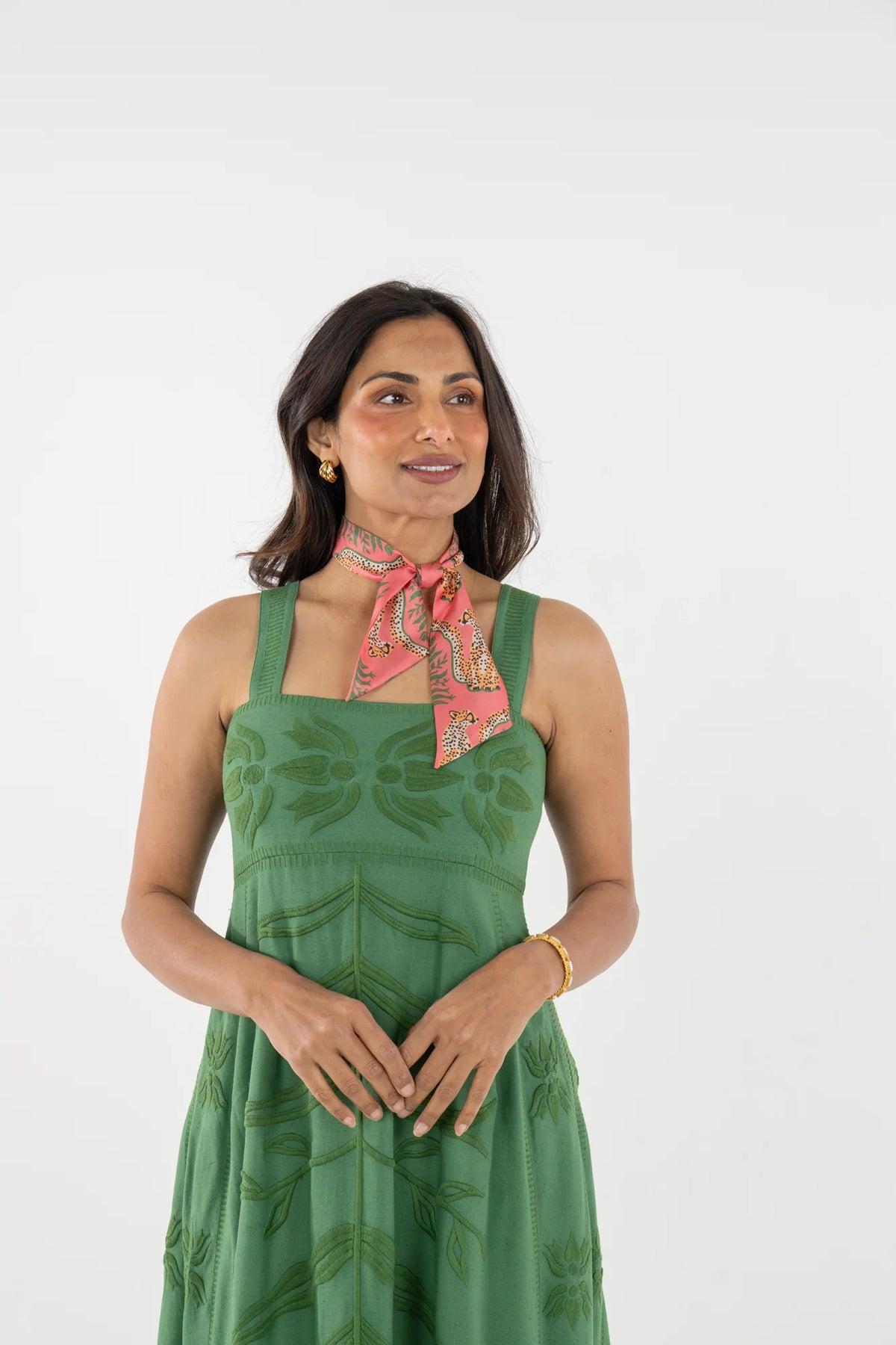 The Cornelia Dress in Rosé is a classic and foundational silhouette elevated through thoughtful craftsmanship. Designed with a round neckline, classic short sleeves, and a relaxed, flowing shape, it offers effortless polish. A green floral appliqué brings traditional Indian motifs to life, with each stitch adding subtle, artful texture. Romantic and refined, this piece feels both heirloom and modern—a true celebration of quiet detail and design.