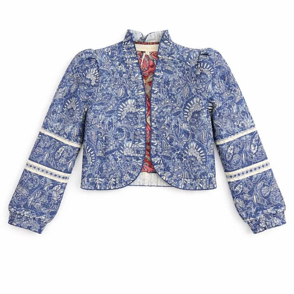 Regular price $375.00The Adrienne Jacket is forever a statement piece in your outerwear wardrobe. Crafted in printed quilted cotton in the Arabesque Print, it features a ruffle-trim collar that extends around the neckline and into the hem, along with a contrast interior printed lining.