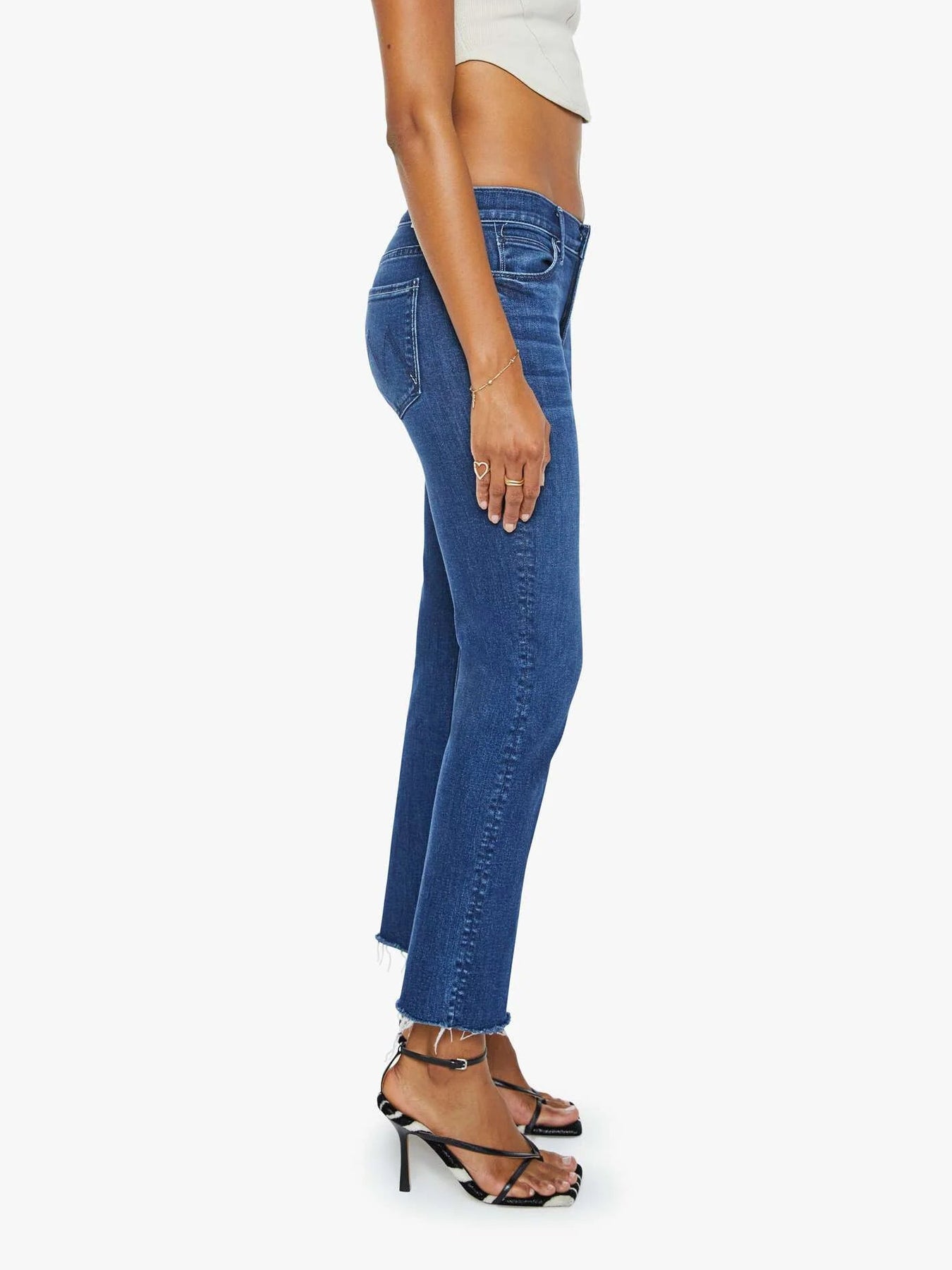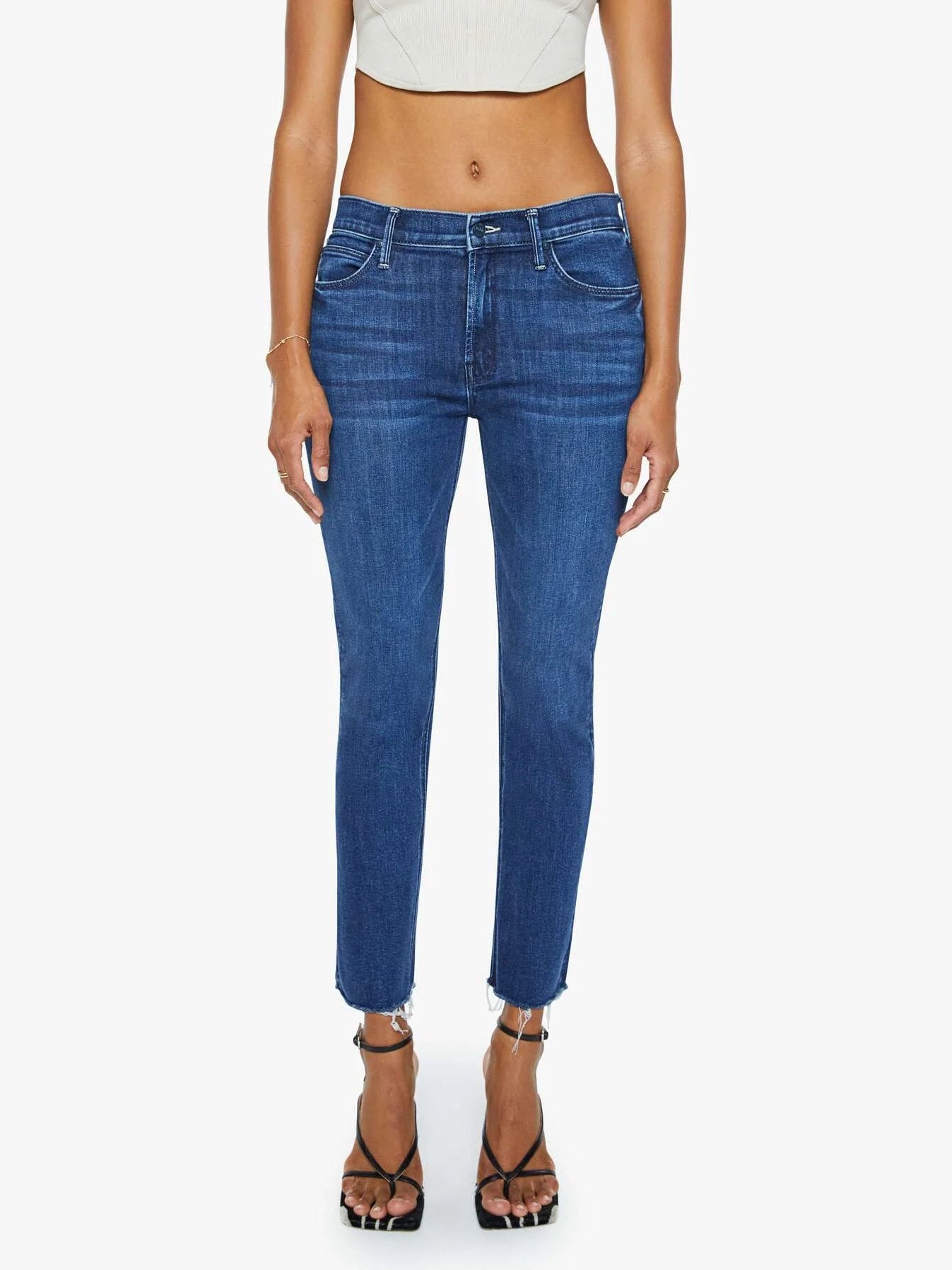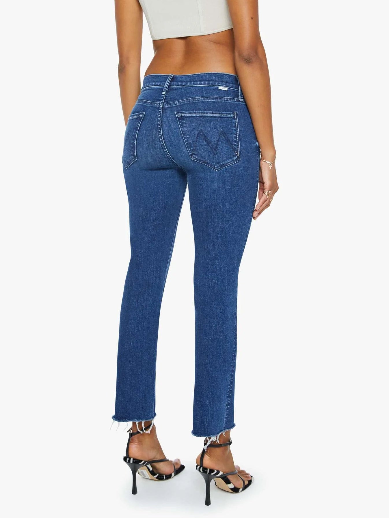 Mother's most popular jean with a mid-rise, straight leg, and a frayed hem. Made from stretch denim, Fancy Meeting You Here is dark blue with subtle whiskering and fading at the knees. Pair with your favorite fall outfit, or let it transitional you into spring with light sweaters and a trench, this jean is always in style.