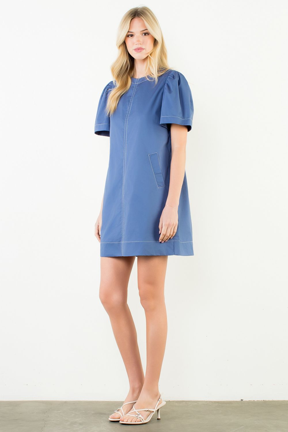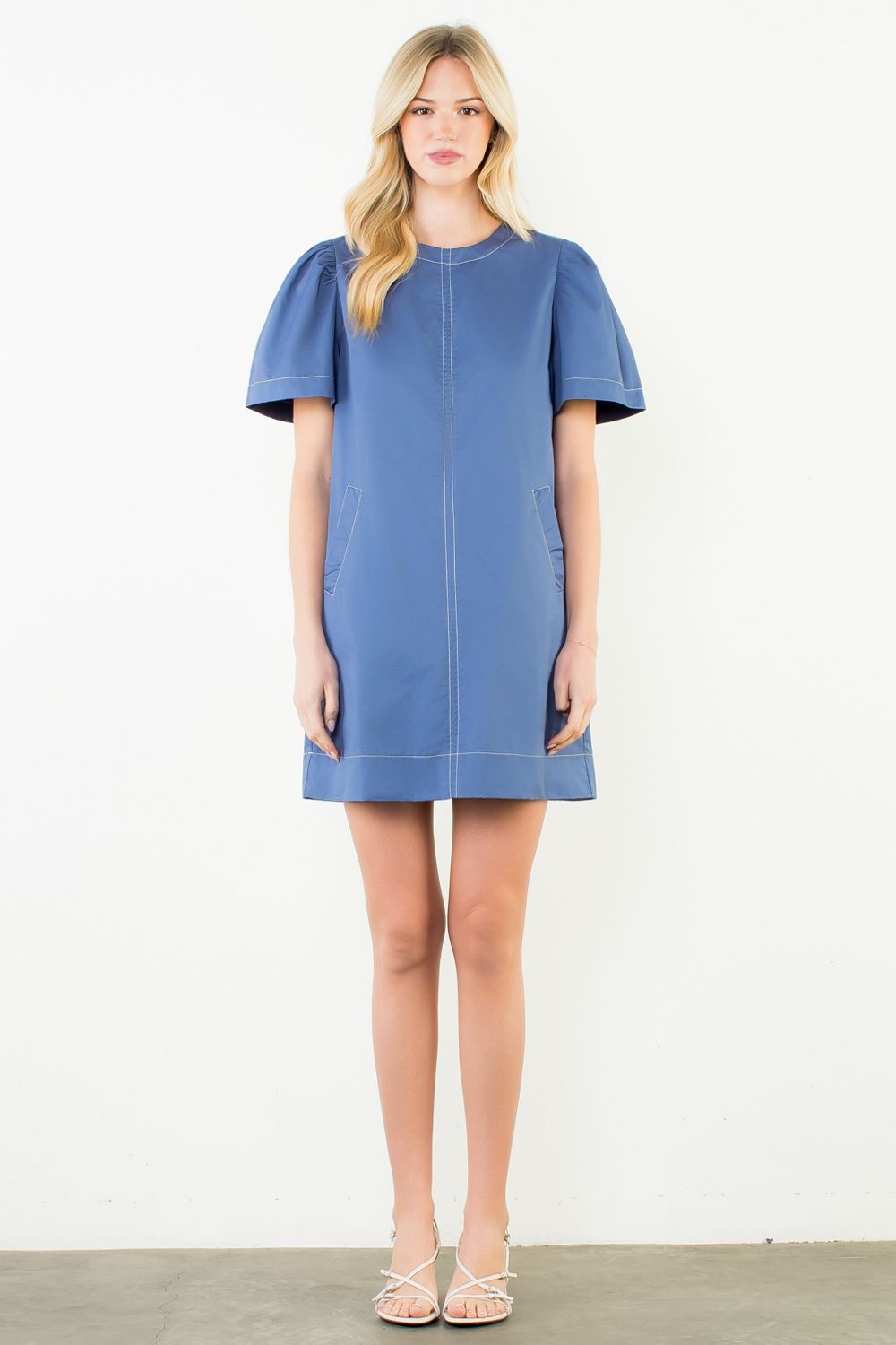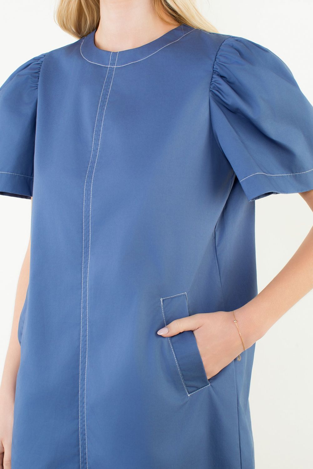 Our Ruthie shirt dress style with an inverted pleat in the front and back , cozy side pockets, shirt collar and split cuffs for an easy shirt look. Made of an easy, polished, breathable cotton. 97% cotton poplin. 3% spandex.