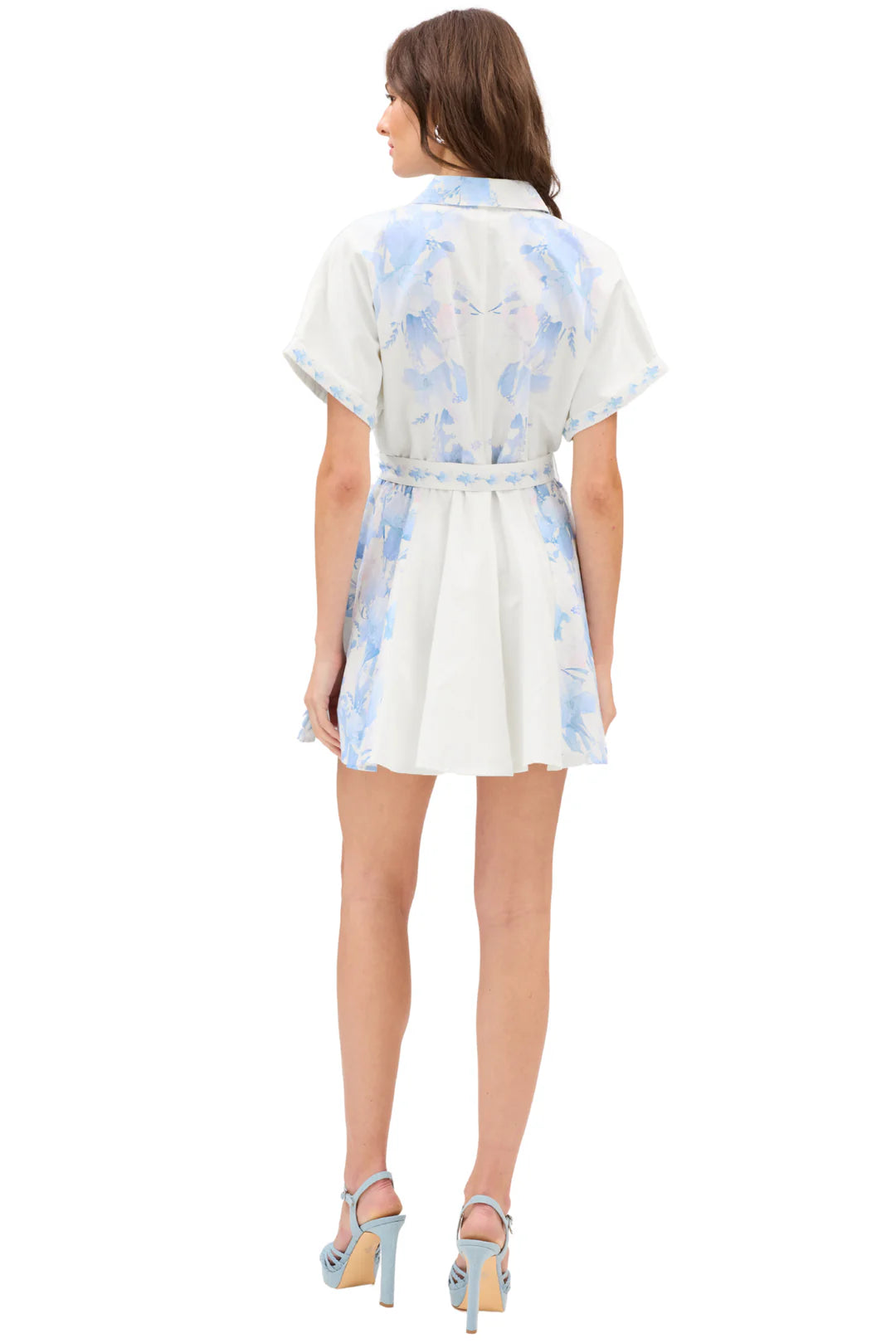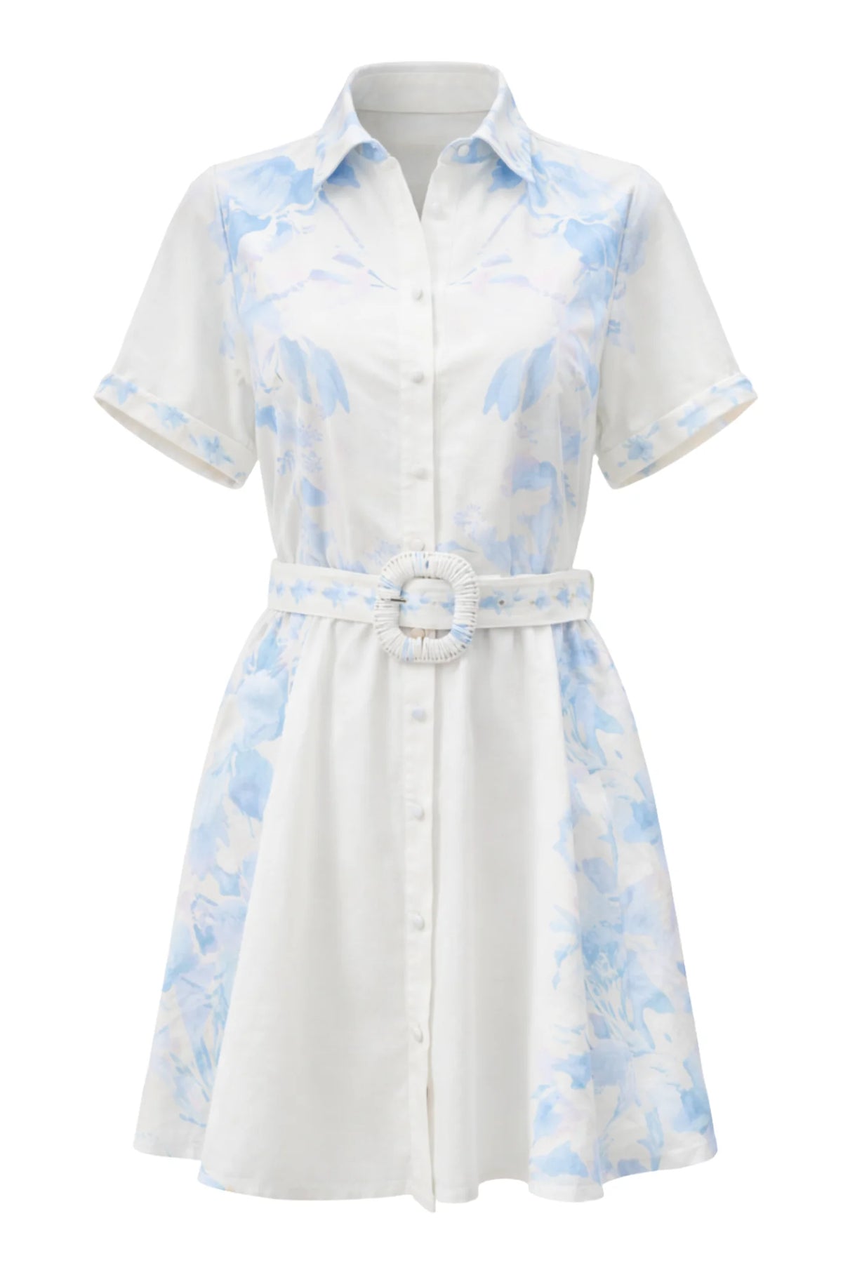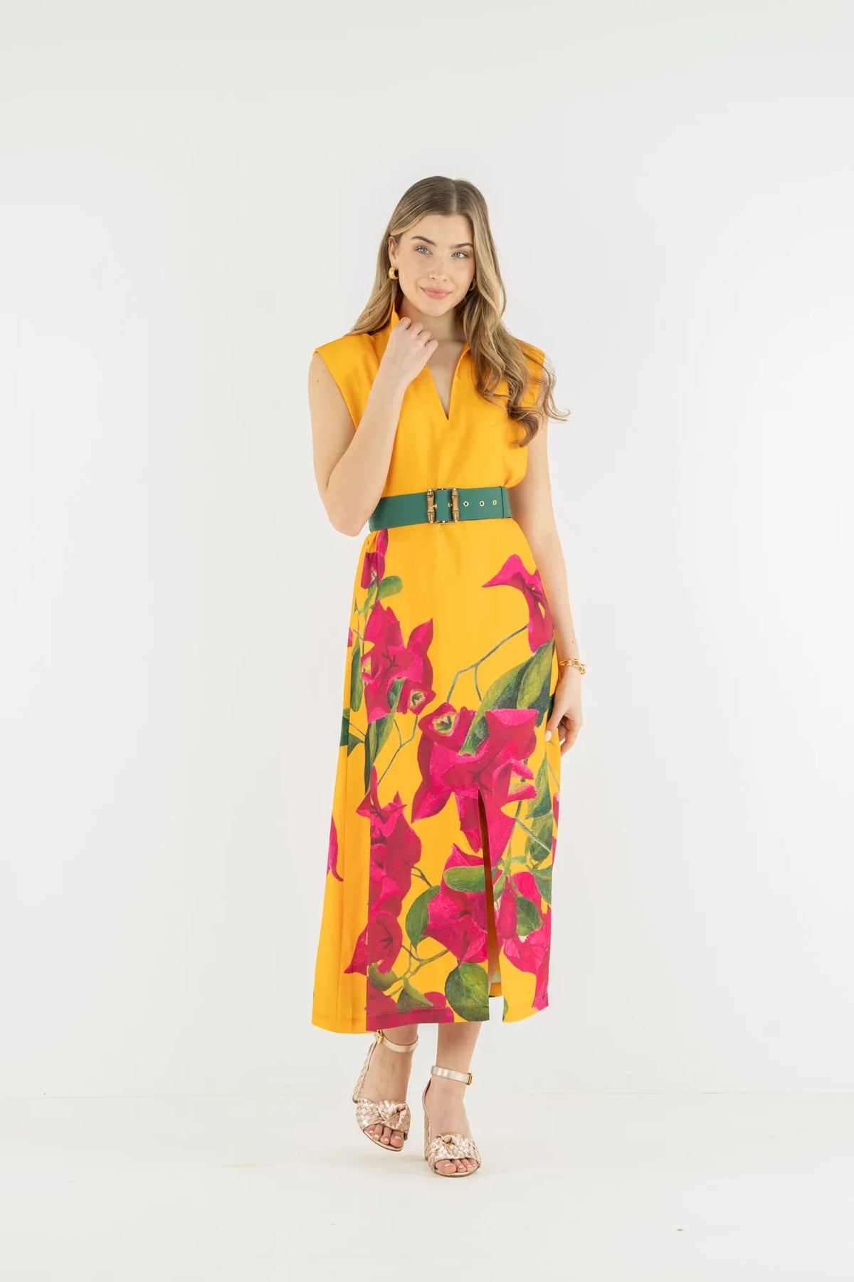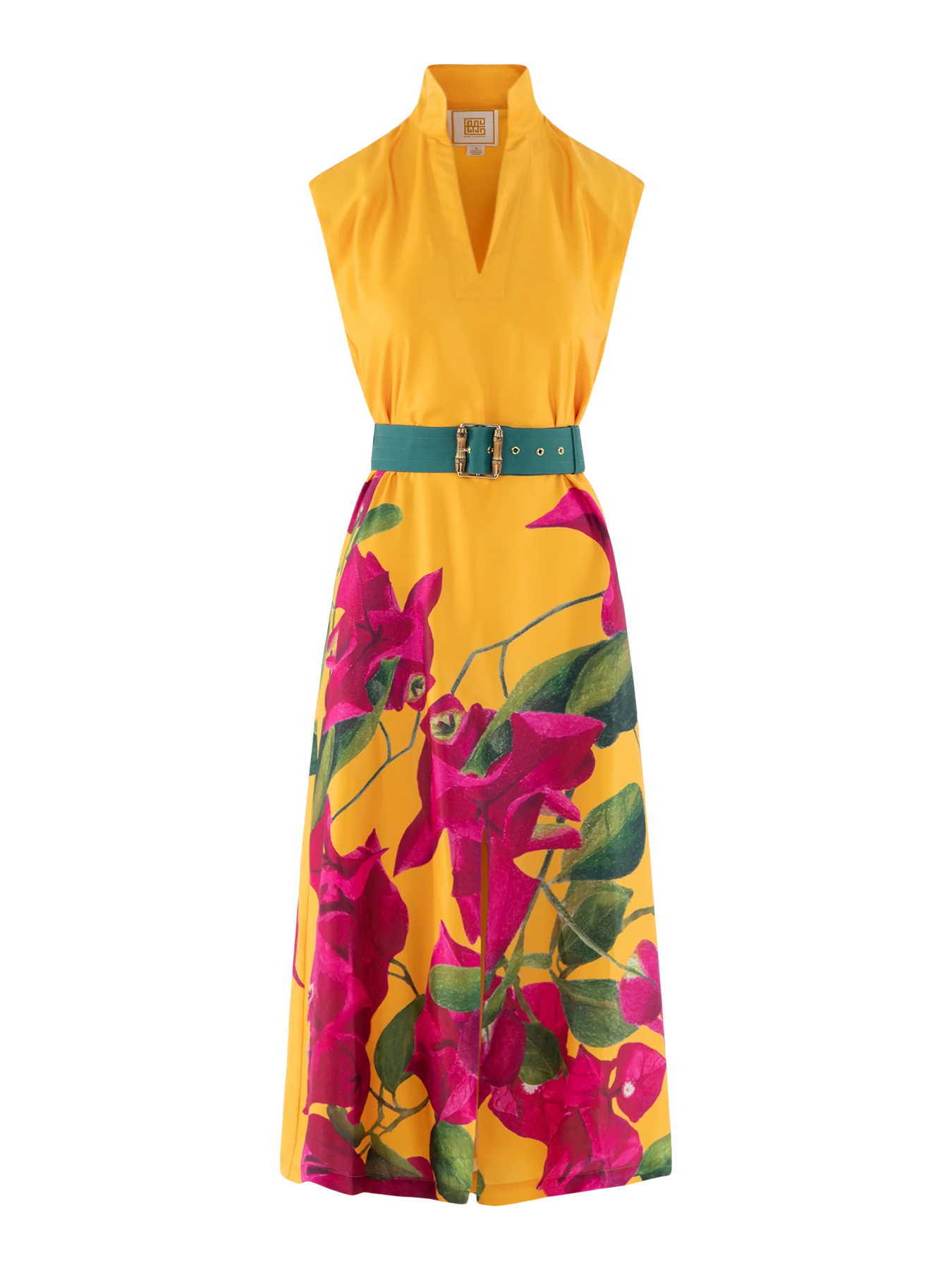 Set against a vibrant palm green backdrop, oversized ivory florals bloom across the silhouette in a striking, artful pattern. A vivid coral bib neckline creates a beautiful contrast, framed by a clean split collar that adds just the right touch of structure. The tailored yoke draws the eye upward, balancing the relaxed drape of the body for a look that feels both polished and easy.