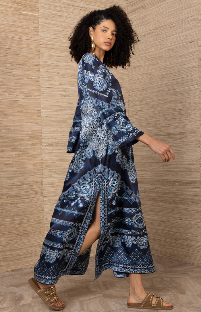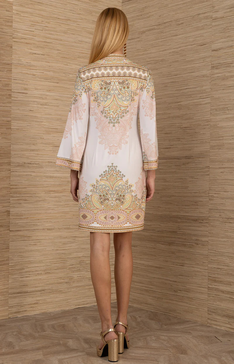 Feminine ruffles and a fixed cape silhouette bring the romantic elegance of the Reeves dress to life. Designed to move with ease, its silk-blend fabrication is as effortless on the eyes as it is on the social calendar, looking equally at home at a dinner party with friends or a museum outing. Our Trinity paisley in a creamy palette heightens the impact, while the flowing hem completes the contemporary cut.