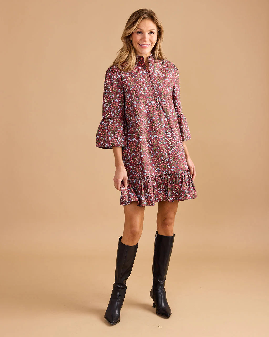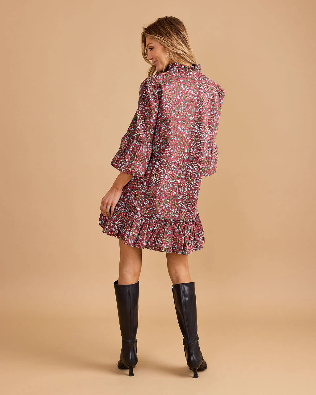The Chelsea Dress in Climbing Floral is a playful yet polished mini featuring a ruffled hem, flounce sleeves, and a high neckline. Its charming print and easy silhouette make it perfect for everything from casual brunches to evening outings.