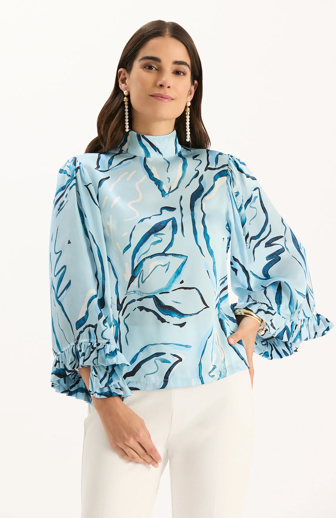 The Sarah Charmeuse Mock Neck Top brings instant elegance and feminine charm with its flowing leaves print, mock neckline, and billowy sleeves. Tuck it in or wear it loose – this statement piece will elevate any look.