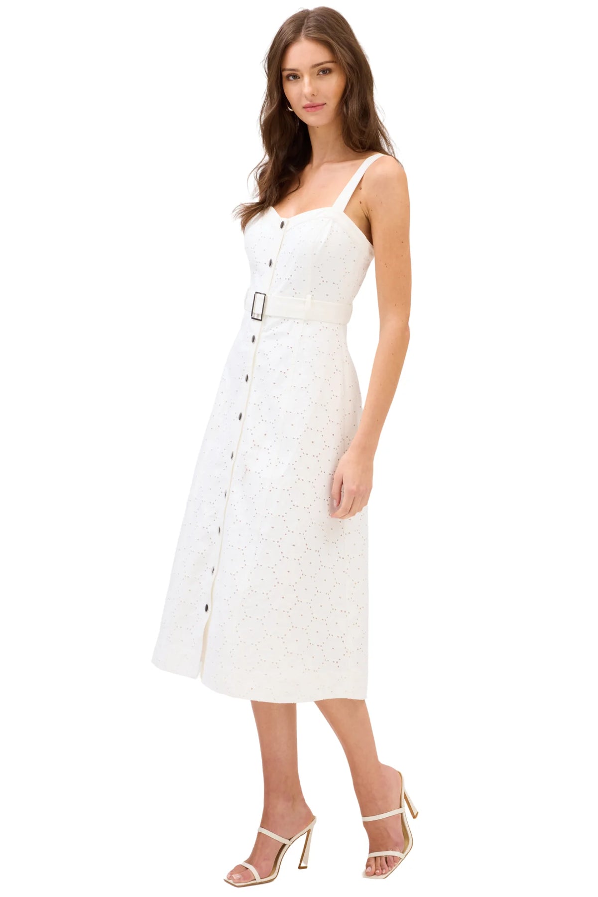 - Fit: Adjustable straps with back button. Princess seams for more shaping and a great fit. Center front silver button closure. Removable fabric belt with silver buckle. Fully lined.