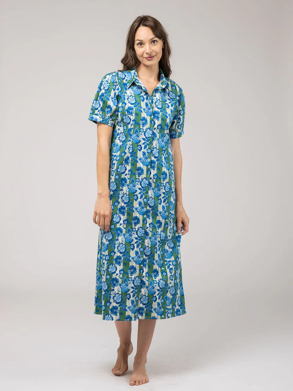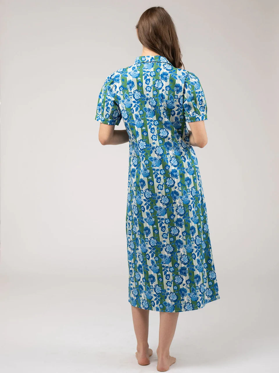 The Kris Dress features a collared neckline, short length puff sleeve with elastic cuff and a button front closure.
