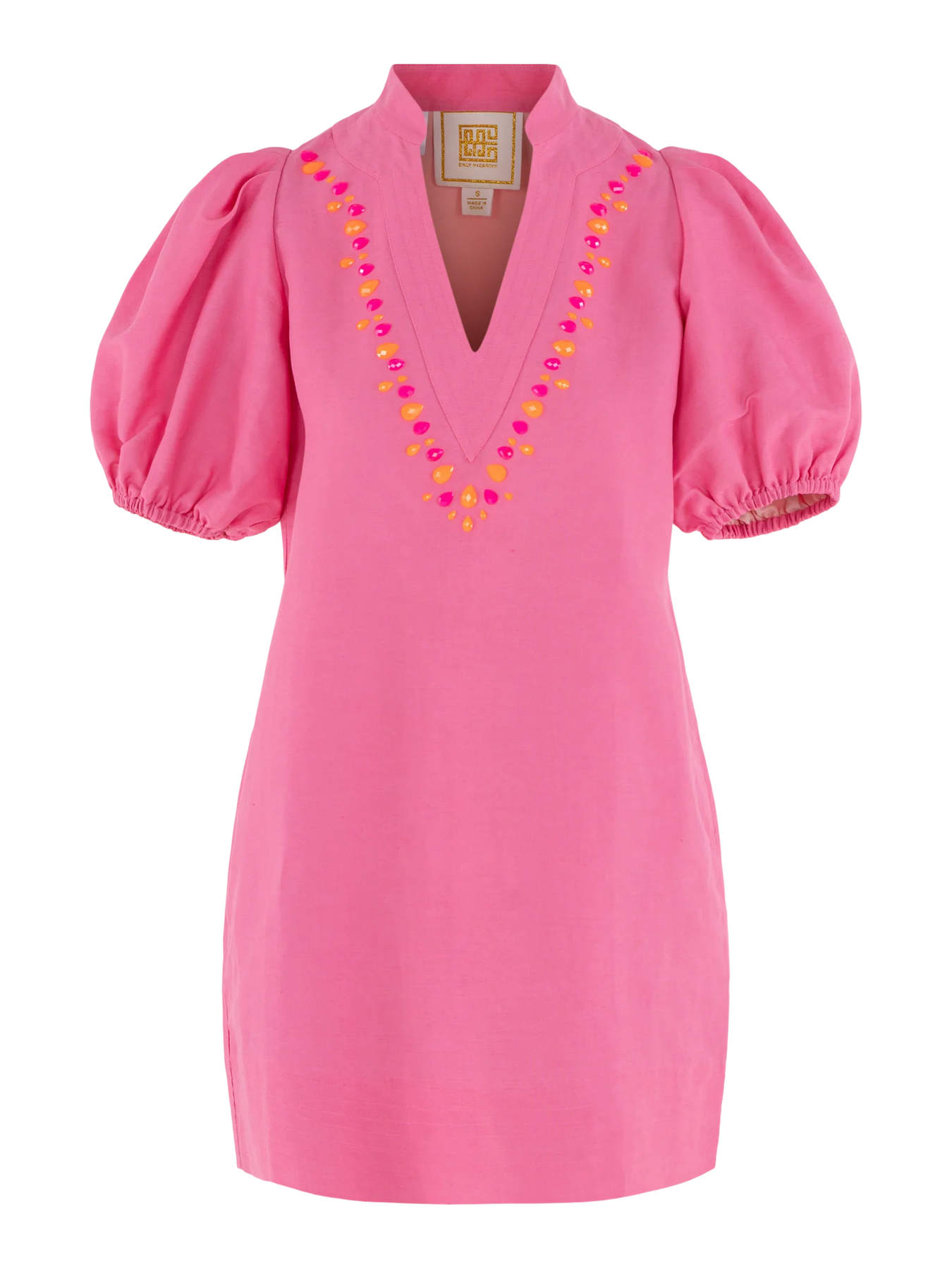 The Hampton Mini in Rosé is a vibrant, event-ready silhouette with composed detail throughout. Designed with a mandarin-style collar, softly puffed sleeves with elastic cuffs, and a subtly tailored shape, it’s finished with functional side pockets for ease. Pear-shaped stones in vivid pink and orange trace the trapunto-stitched neckline, adding a playful yet polished touch that elevates this standout mini.
