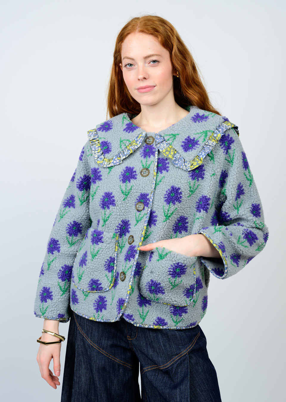 Meet your new favorite layer! This Ivy Jane sherpa jacket brings serious charm with its adorable peter pan collar featuring sewn-on ruffled fabric details. Slip into the cozy 100% polyester sherpa and button up for instant style points. Two front pockets keep your essentials close, while long sleeves provide the perfect coverage. A playful piece that's equal parts cute and practical—just remember to dry clean to keep it looking fresh and fabulous.