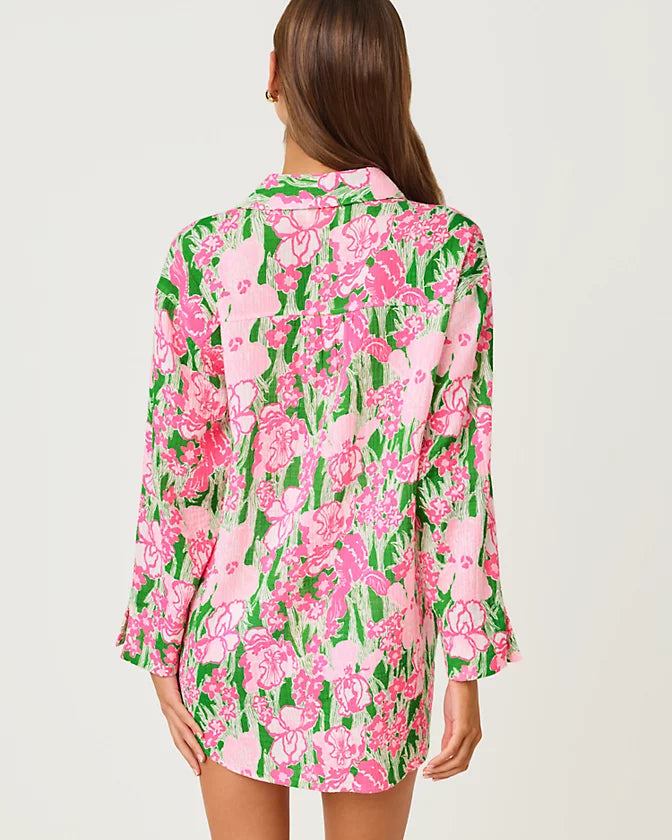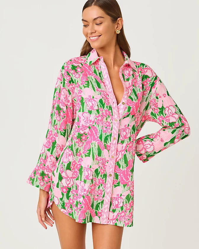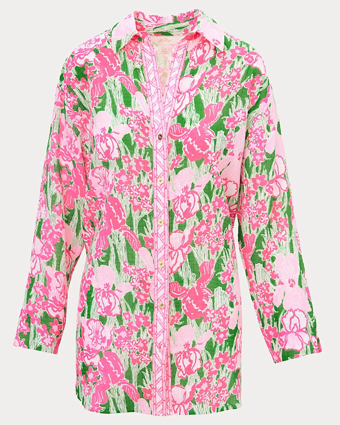 • Long sleeve, button front, collared cover-up with a relaxed fit.