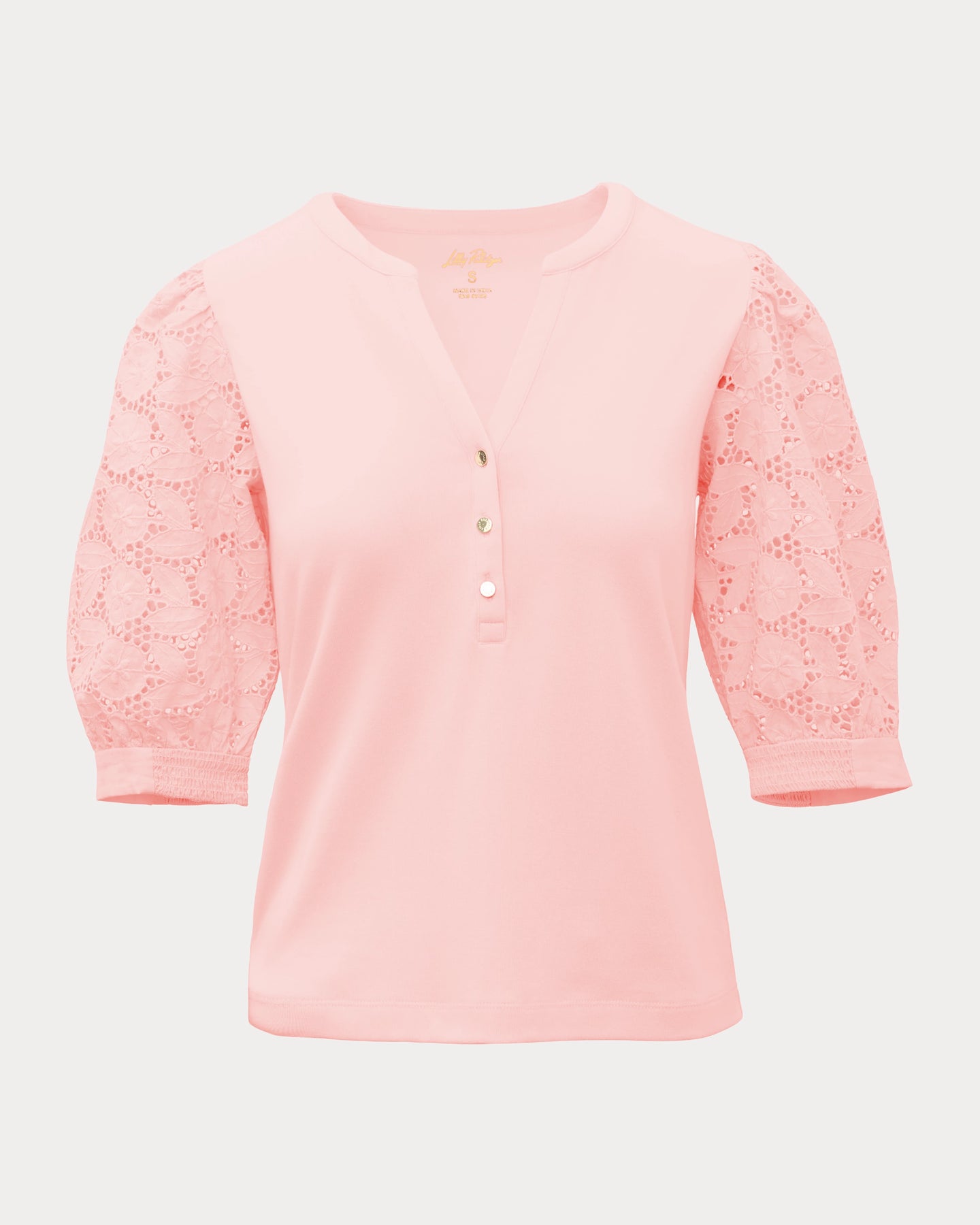 Straight fit top with unlined eyelet puff sleeves, smocked cuffs, buttons, and a crew notched neckline.