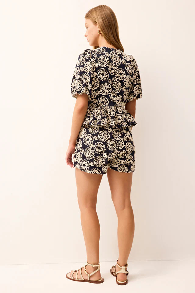 Feminine details define the Estella top, from the tie-front V-neck to the puff sleeves and peplum waist. Versatile by design, it pairs effortlessly with denim, tailored shorts, or the matching Owens skirt. Rendered here in Heron, an abstract avian print in chartreuse, cobalt, and white on a navy ground.