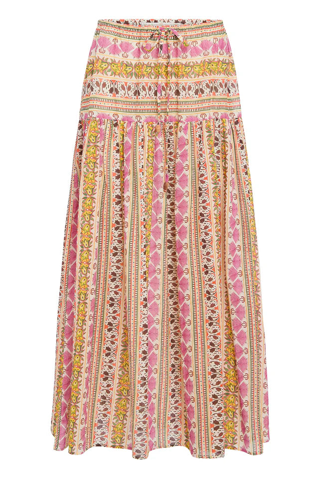 Designed for going from beach to snack bar, our sheer midi-length Louise skirt is made from a lightweight cotton and features a drawstring waistband, a stylish drop waist yoke, and a jungle-inspired placement print along the hemline. Louise is pictured here with our crochet Mira top in a coordinating walnut brown.