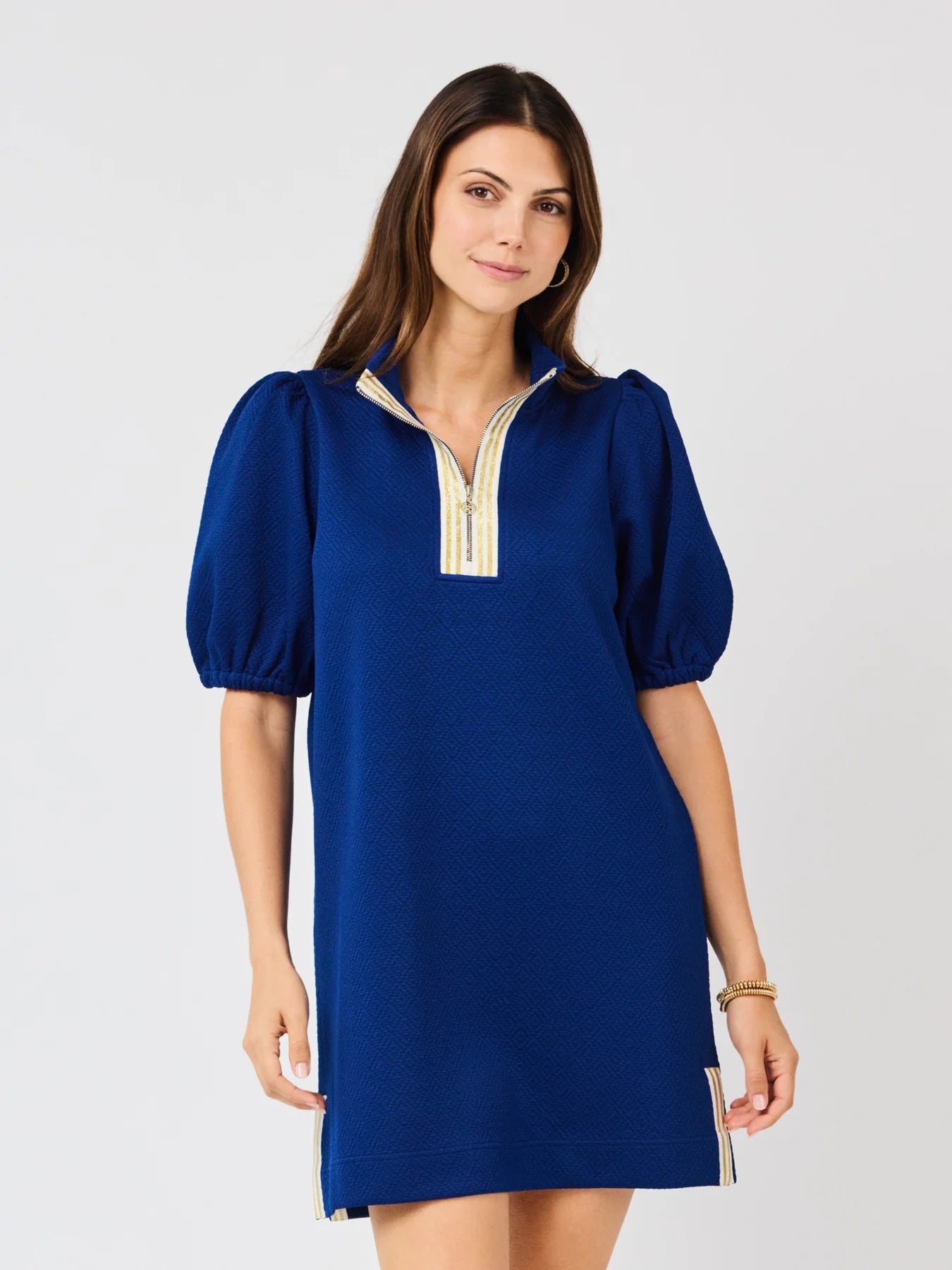 Introducing the Andie Dress - made from our exclusive new crosshatch jacquard fabric. This dress features elegant puff sleeves with an elastic finish, adding a refined touch. The pop-collar and stripe trim ribbon detail at the placket offer a distinctive flair, while side slits ensure effortless movement.