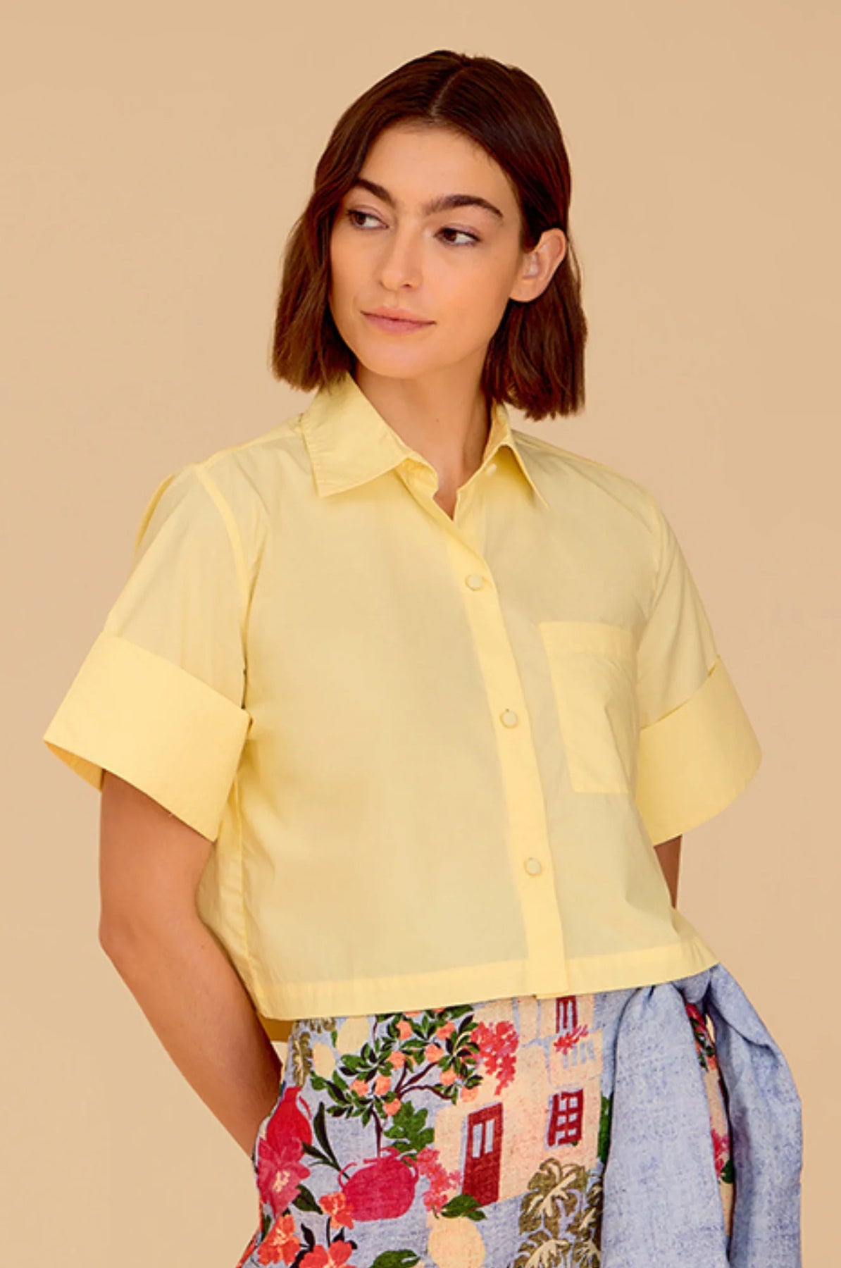 New this Spring! The Kyle Shirt elevates the short-sleeve button up. This effortlessly chic piece features folded sleeves and a flattering cropped cut. Pair with your favorite patterned bottoms or with the Isla Wrap Skirt as pictured.
