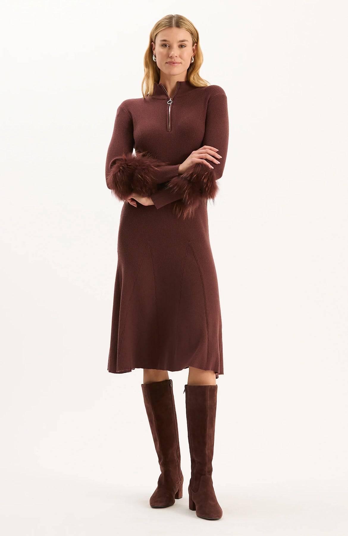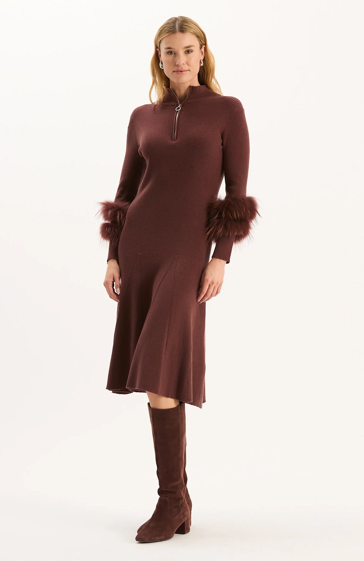 A must-have for your special occasions this season, the Celia Knit Fur Sleeve Dress is a fun and glamorous style with a mock neck and fur cuffs. The elegant silhouette features a fitted bodice, long sleeves, and a midi length that creates a sophisticated and party-ready look.
